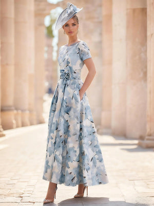 A-Line Mother of the Bride Dress Asymmetrical Ankle Length Floral Cocktail Dress Short Sleeve Bateau Neck Elegant Formal