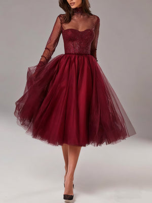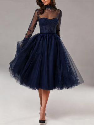 A Line Cocktail Dress Long Sleeve Party Dress Tea Length Tulle Formal Dress With Semi-Transparent Corset Vintage Elegant Princess