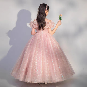 Short Sleeves High Low Round Neck Flower Girl Party Dress with Rhinestone Appliques