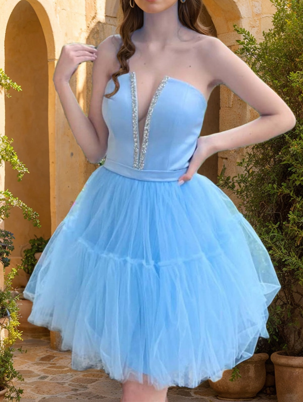 A-Line/Princess Strapless Sleeveless Short/Mini Homecoming Dresses with Lace-up & Rhinestones
