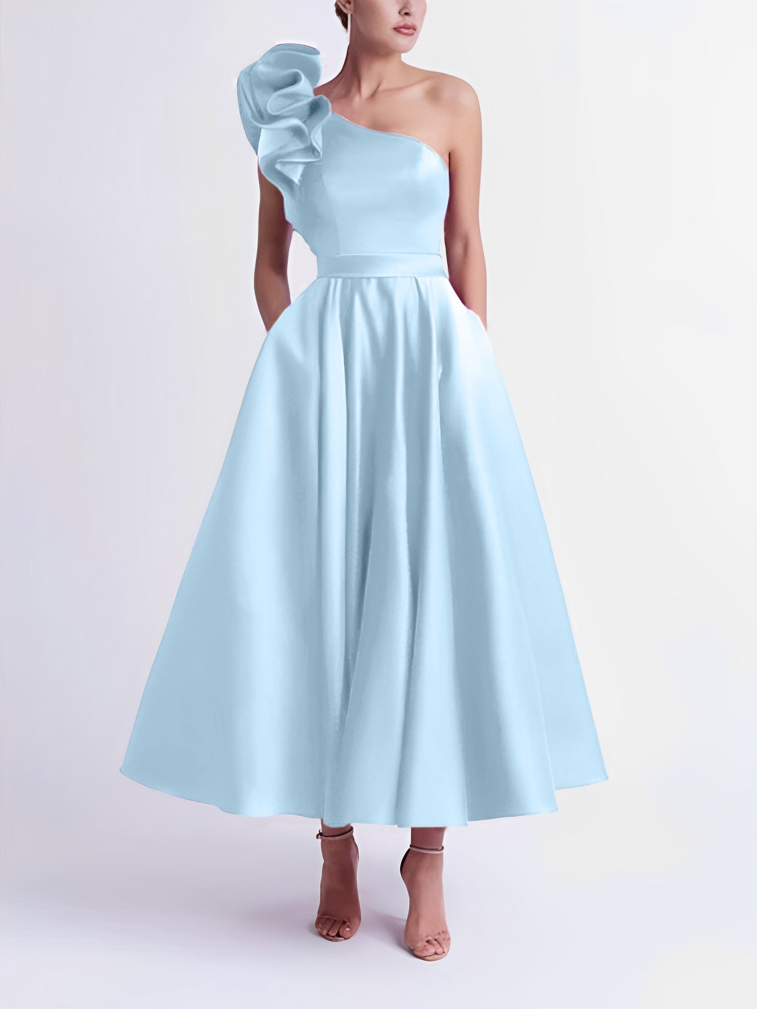 #N341431 A-Line/Princess Cocktail Dress One-Shoulder Tea-Length Formal Wedding Guest Dresses