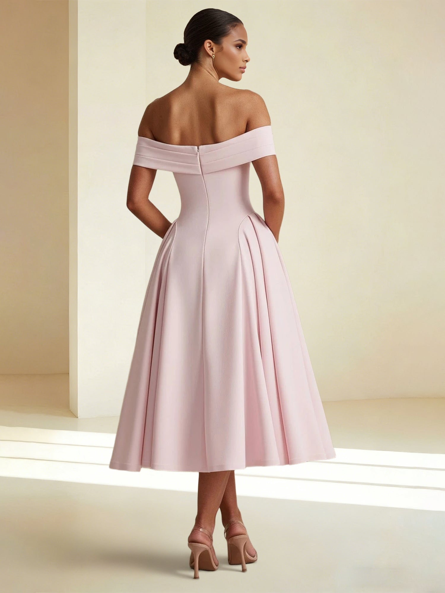 • A-Line/Princess Elegant Cocktail Dress Off-The-Shoulder Sleeveless Tea-Length Stretch Crepe Ruched Dress