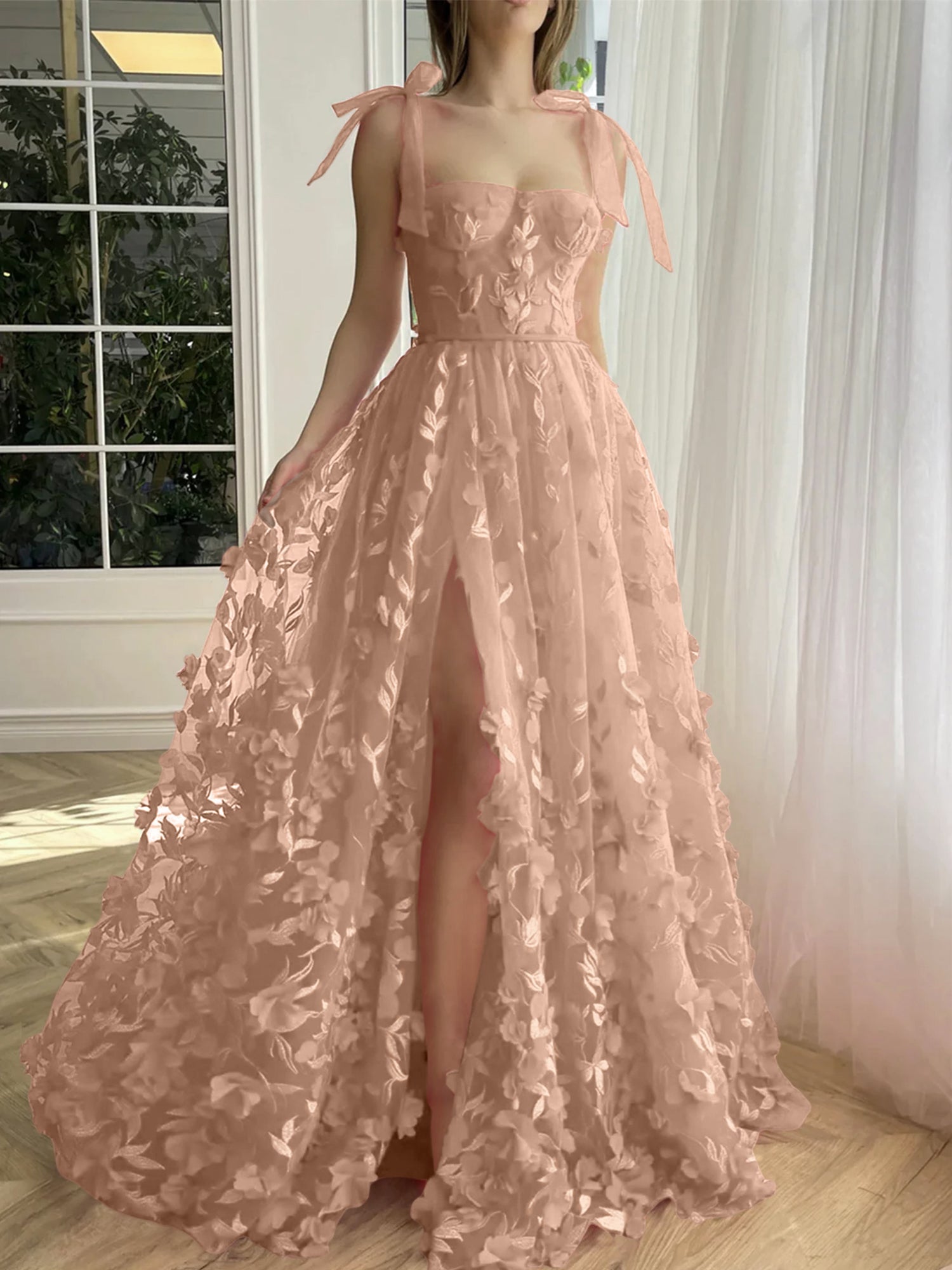 • A-Line/Princess Spaghetti Straps Long Prom Floral Dresses With Split Side