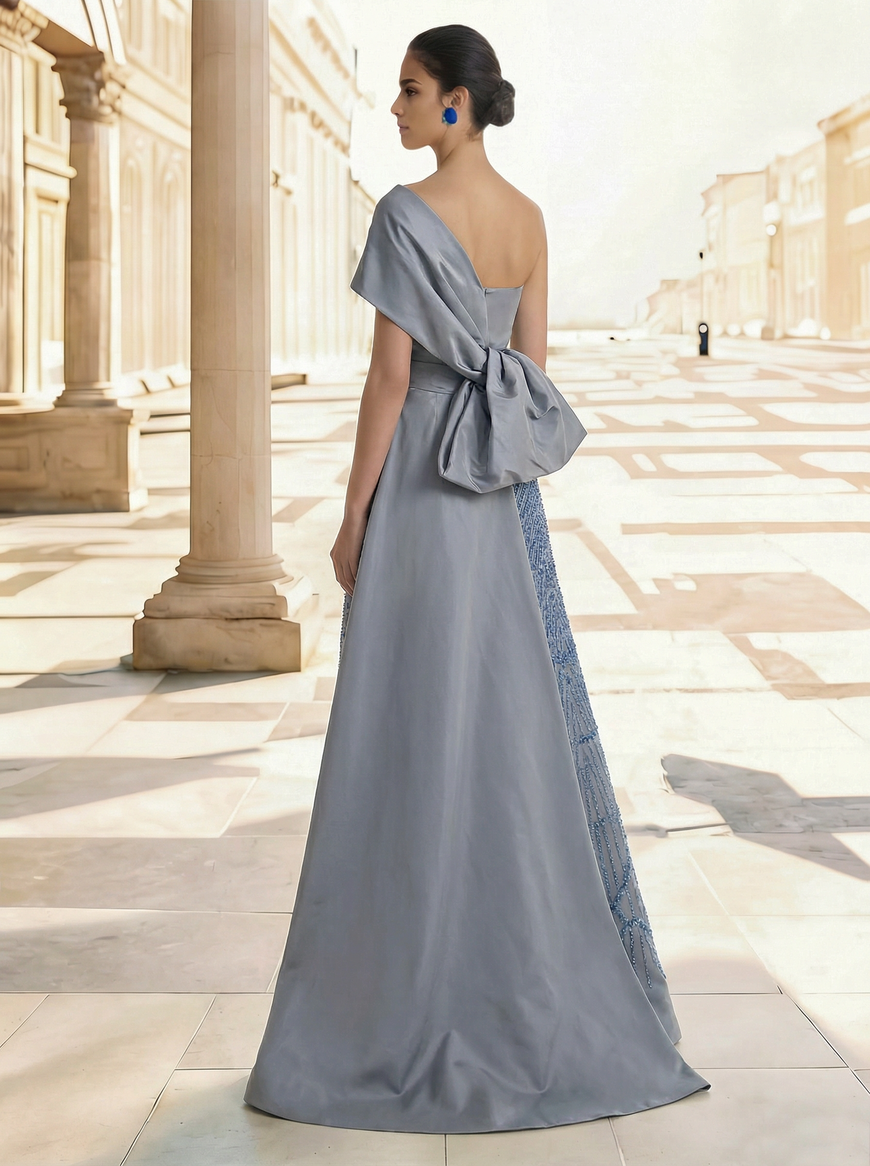 #N350102 Sheath/Column Sequins Sparkle Evening Dress Taffeta One-Shoulder Sleeveless Floor-Length With Back Bow