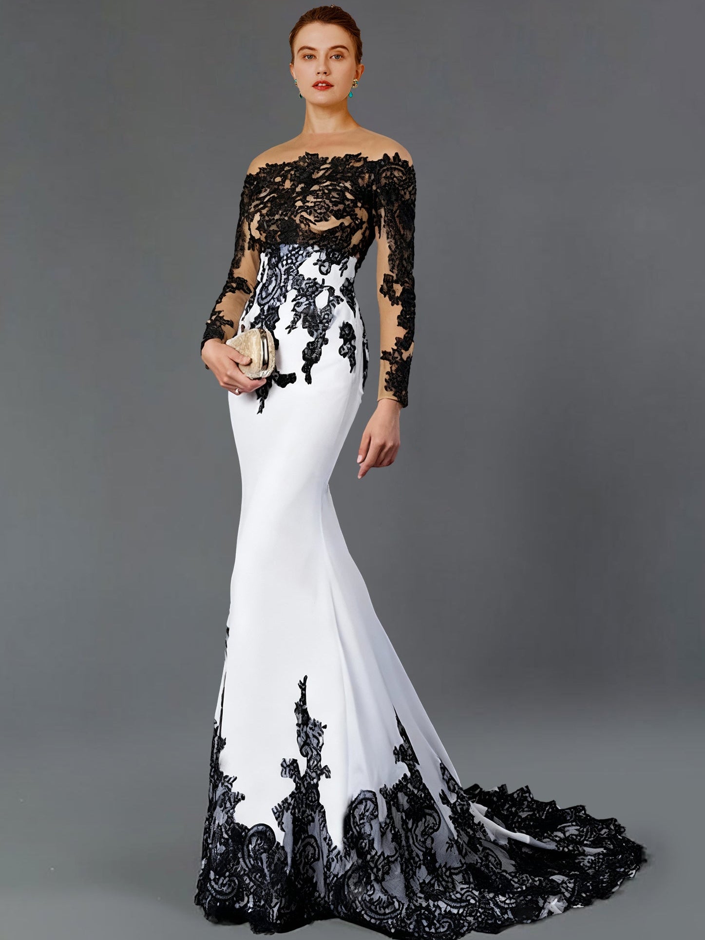 #N352110 Mermaid Mother Of The Bride Dress Color Block Evening Dress Wedding Party Sweep / Brush Train Long Sleeve Off Shoulder Fall Wedding Reception Stretch Fabric with Lace