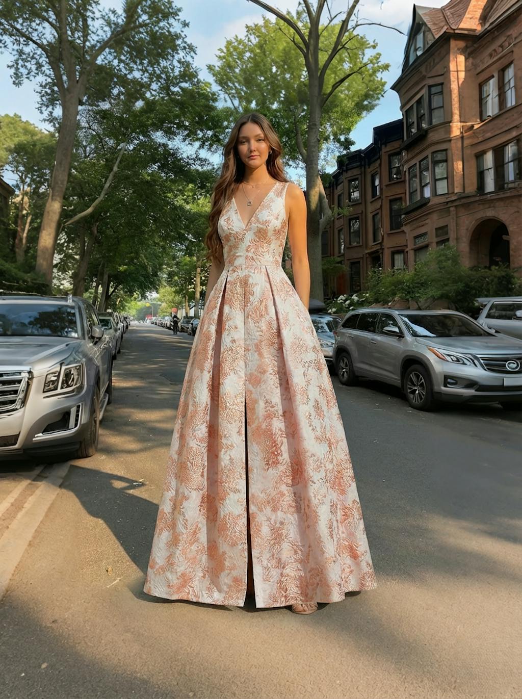#N365801 A-Line Evening Gown Elegant Jacquard Floral Dress Floor Length Sleeveless V Neck with Pocket Blue Wedding Guest Dress