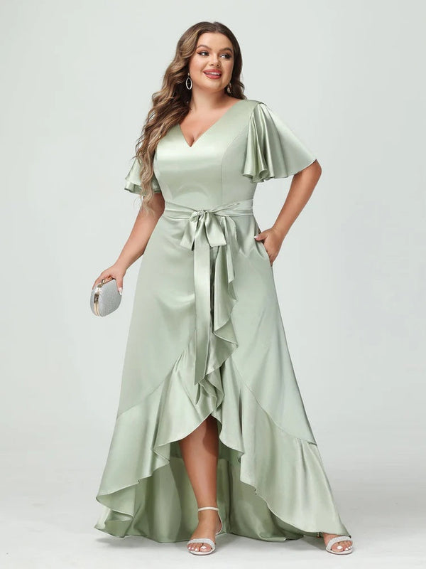 #N5411951 Sheath/Column V-Neck Short Sleeves Ruffles Asymmetrical Plus Size Dresses with Pockets & Sash