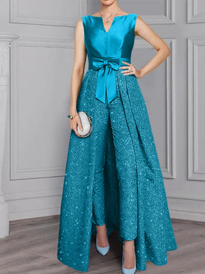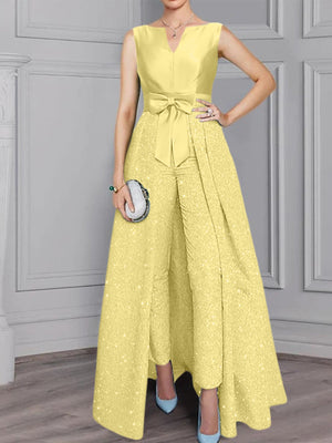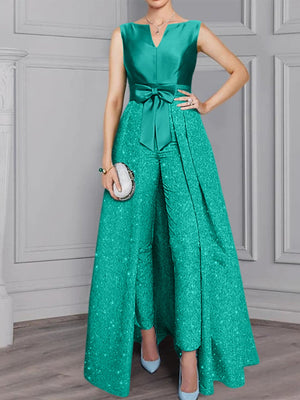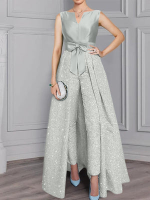 2 Pieces Scoop Long Sleeves Mother of the Bride Pantsuits with Sash & Sequins