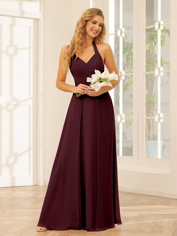 #N5411899 A-Line/Princess Halter Sleeveless Floor-Length Bridesmaid Dresses with Split Side