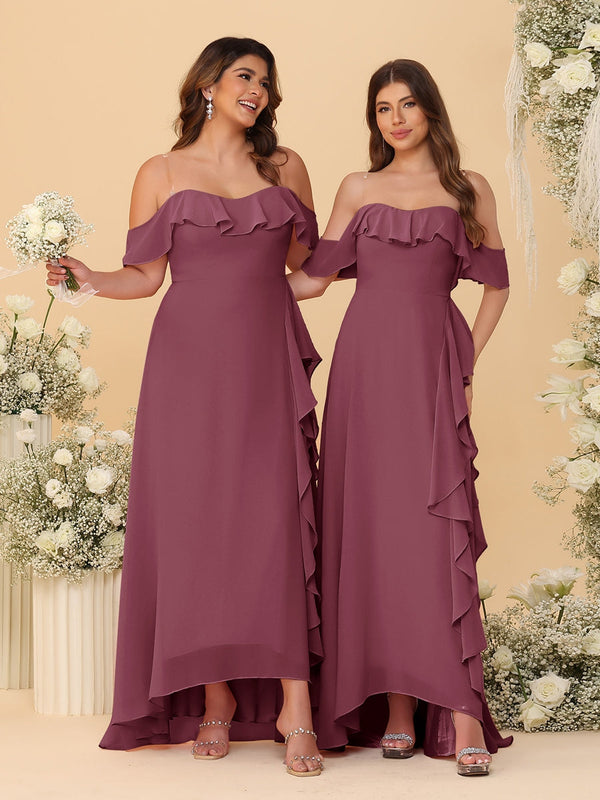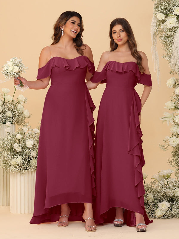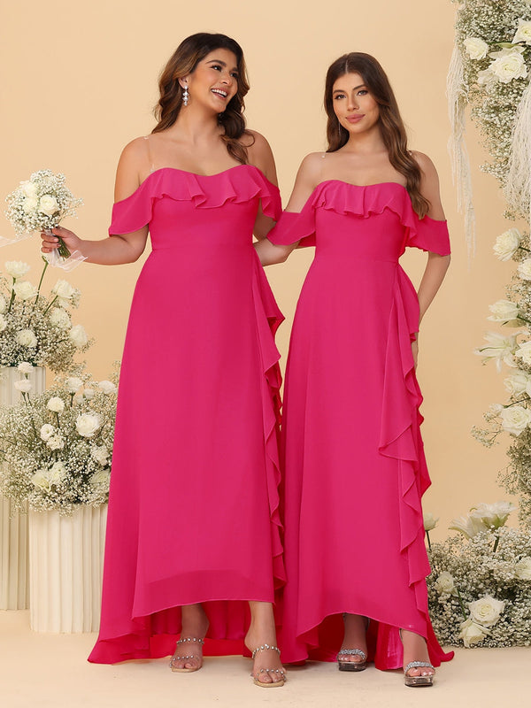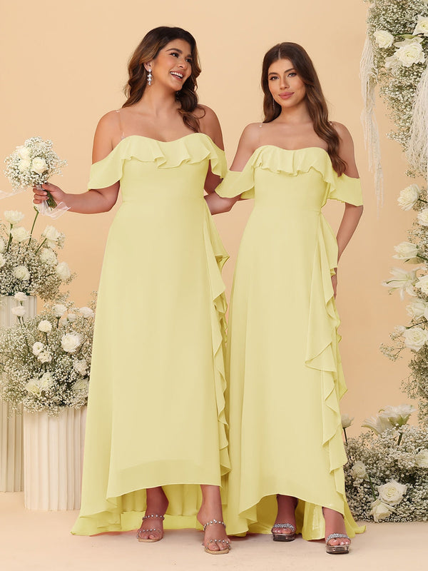 #N99122129 A-Line/Princess Off-the-Shoulder Spaghetti Straps Sleeveless Bridesmaid Dresses with Ruffles