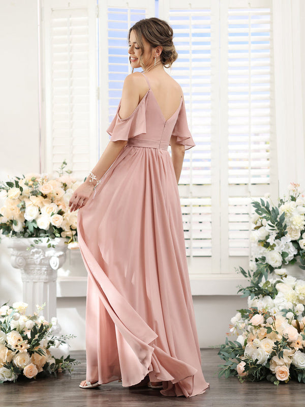 #N5411858 A-Line/Princess Spaghetti Straps Floor-Length Chiffon Bridesmaid Dresses with Split Side & Ruched