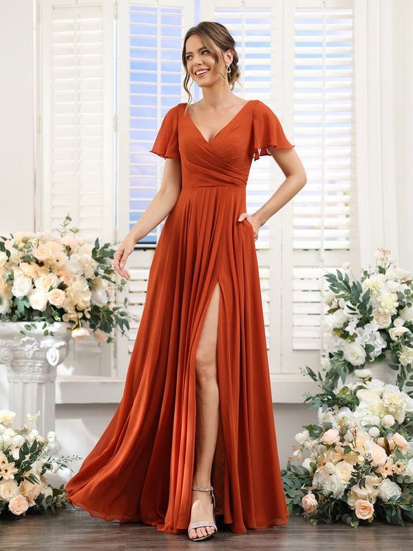 #N5411864 A-Line/Princess V-Neck Short Sleeves Bridesmaid Dresses with Split Side & Ruched