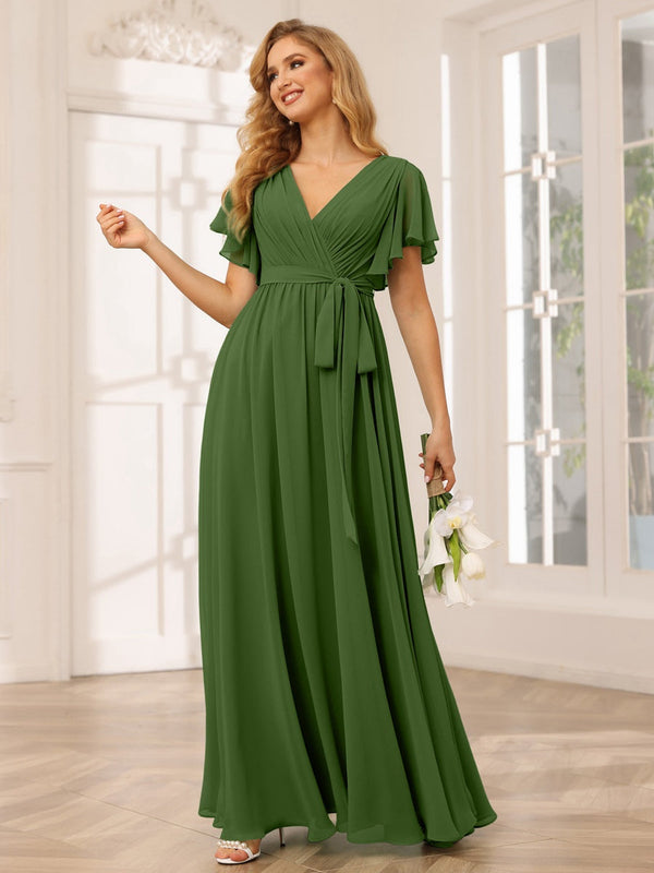 #N5411895 A-Line/Princess V-Neck Short Sleeves Floor-Length Bridesmaid Dresses with Sash