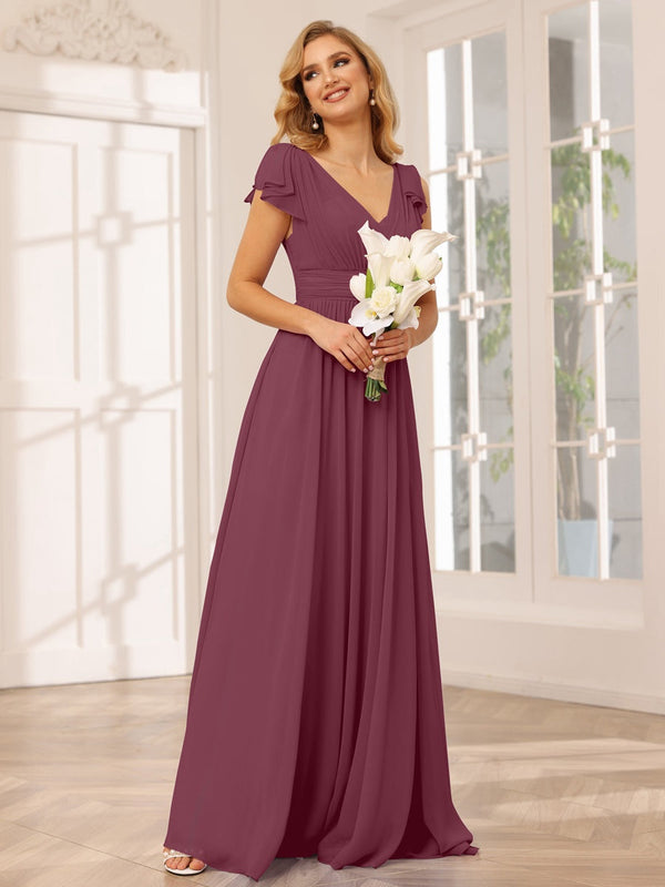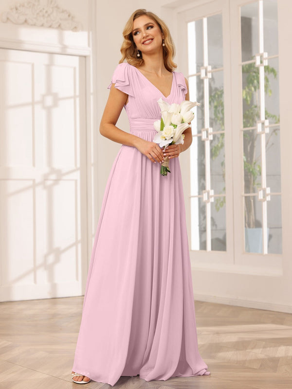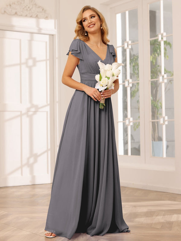 #N5411901 A-Line/Princess V-Neck Short Sleeves Long Bridesmaid Dresses with Ruffles