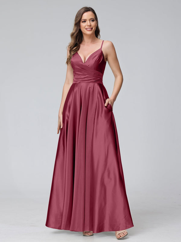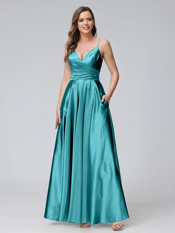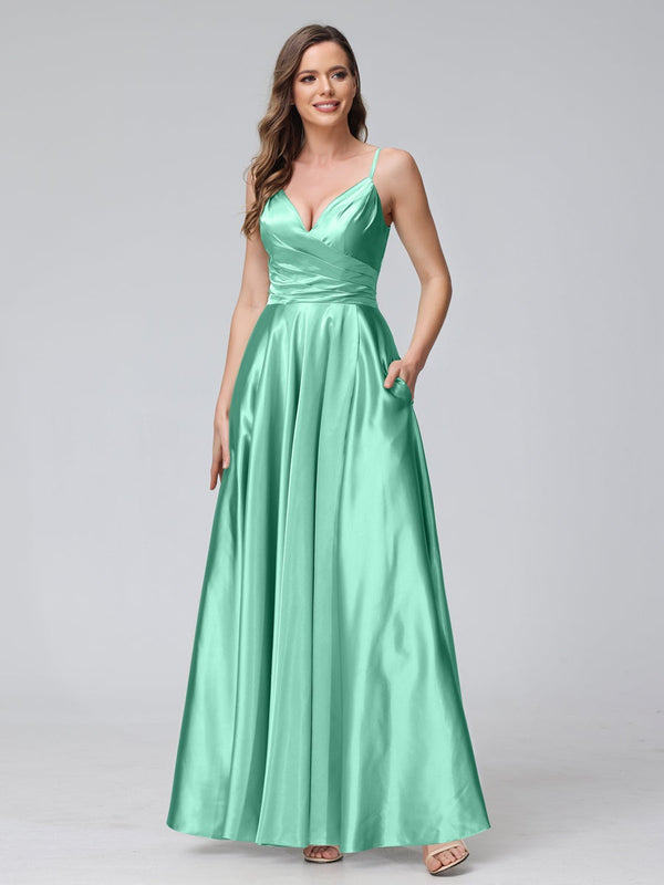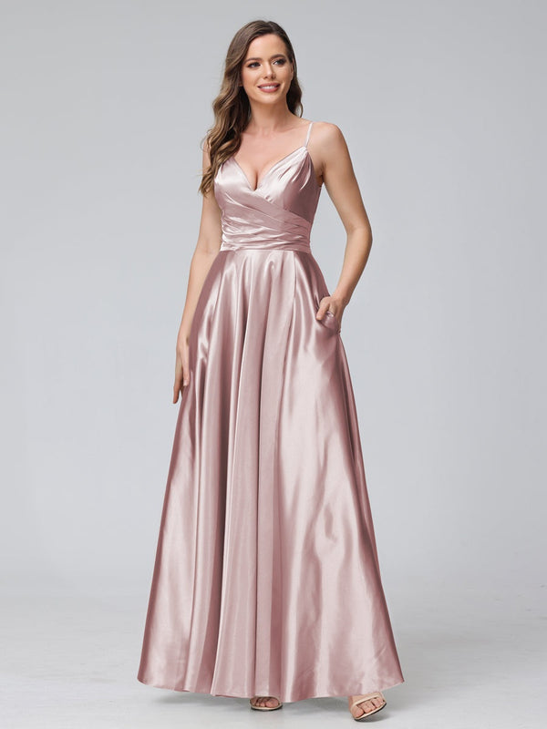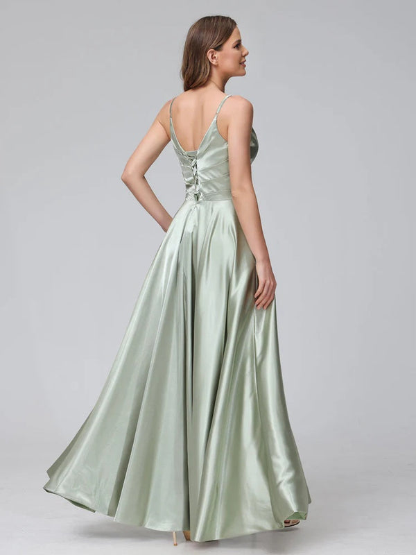 #N5411850 A-Line/Princess V-Neck Sleeveless Ankle-Length Silk Satin Bridemaid Dresses with Pockets & Split Side