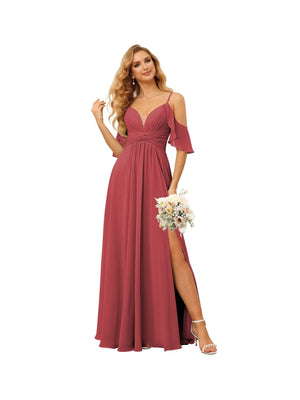 A-Line/Princess Spaghetti Straps Sleeveless Floor Length Bridesmaid Dresses Chiffon with Ruffles Split