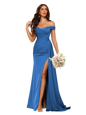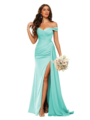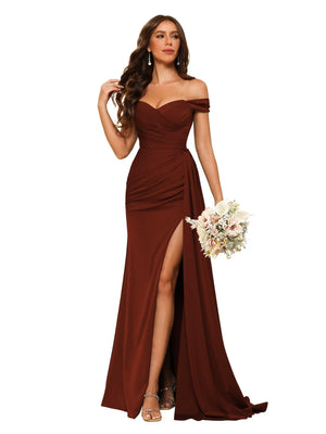 A Line/Princess Strapless Off-the-Shoulder Neck Floor-Length Bridesmaid Dresses with Ruched