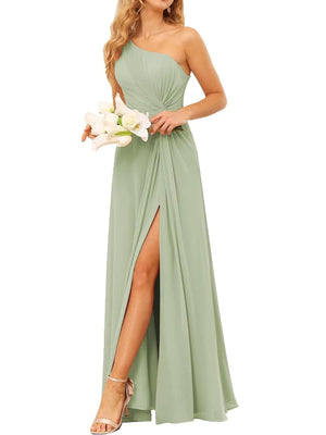 A Line/Princess One-Shoulder Sleeveless Floor-Length Bridesmaid Dresses with Pocket & Ruffles