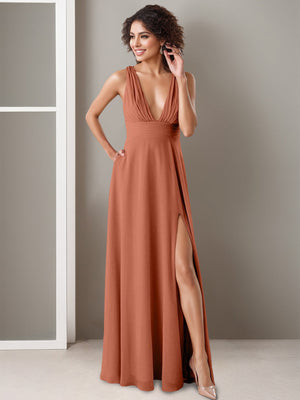 A Line/Princess Deep V-Neck Sleeveless Floor-Length Bridesmaid Dresses with Ruffles & Split Side