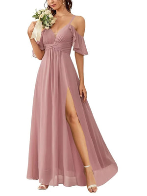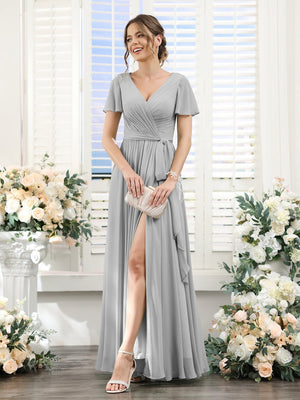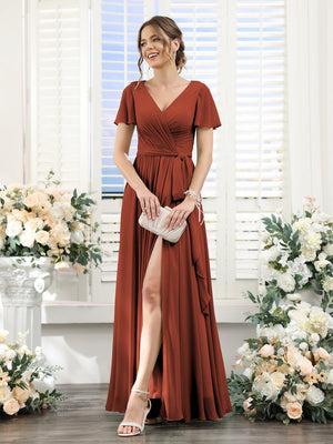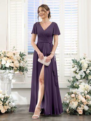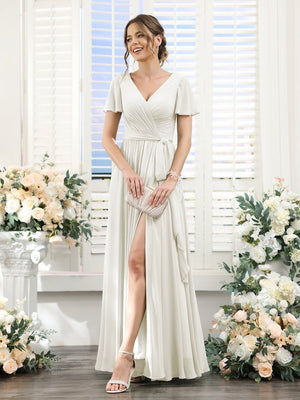 A-Line/Princess V-Neck Short Sleeves Floor-Length Chiffon Bridesmaid Dresses with Split Side & Ruched