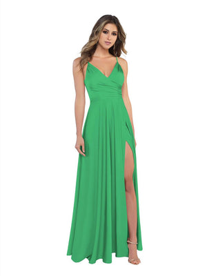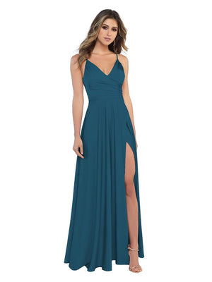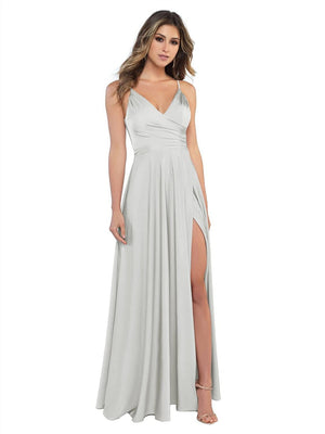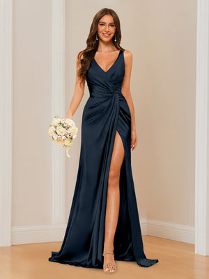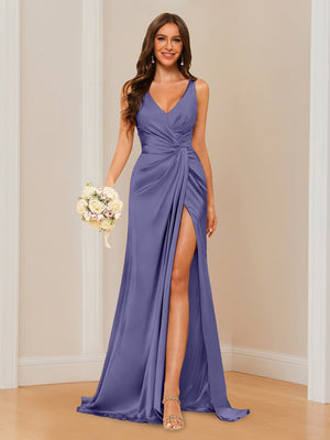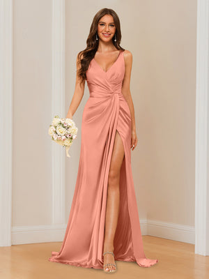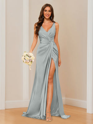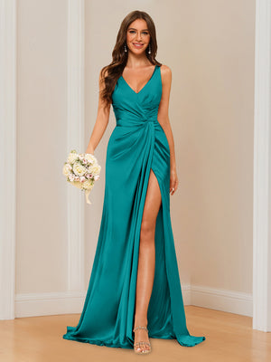 Sheath/Column V-Neck Sleeveless Floor-Length Long Bridesmaid Dresses with Split Side