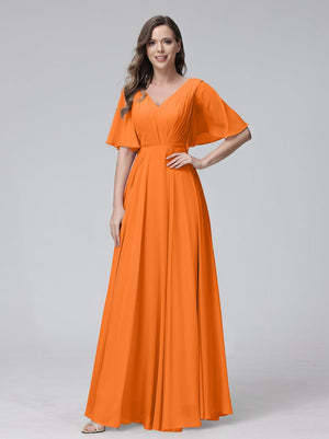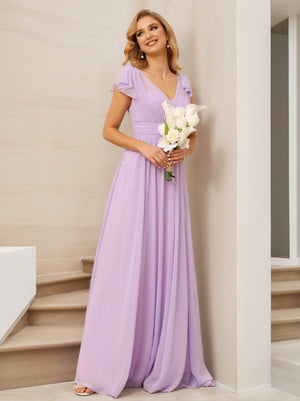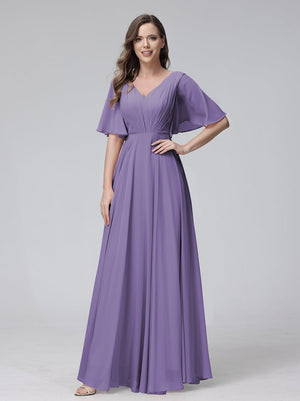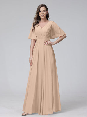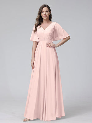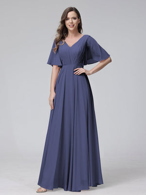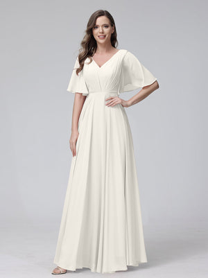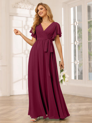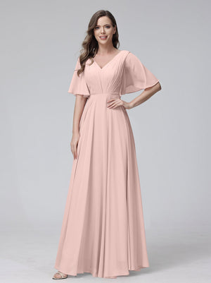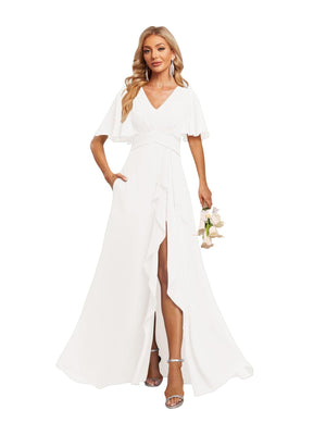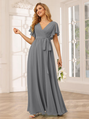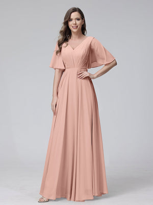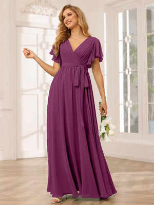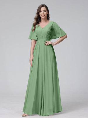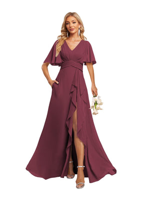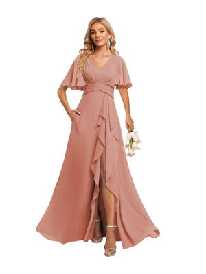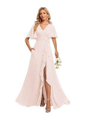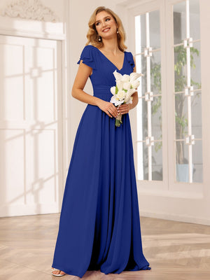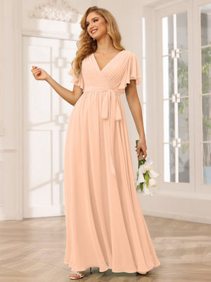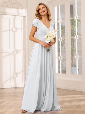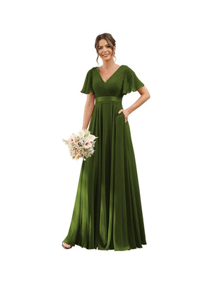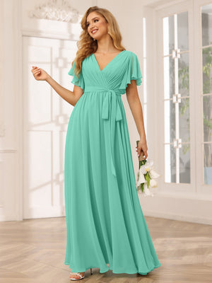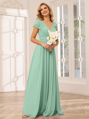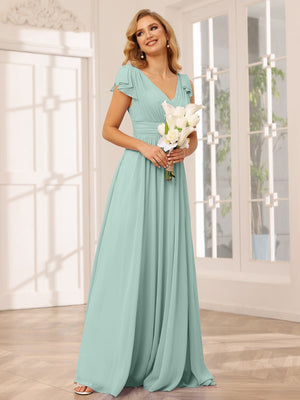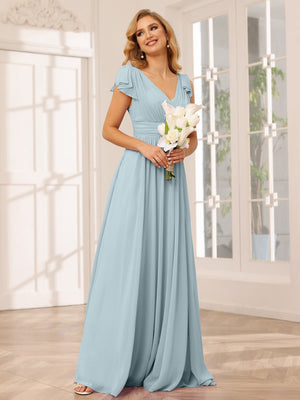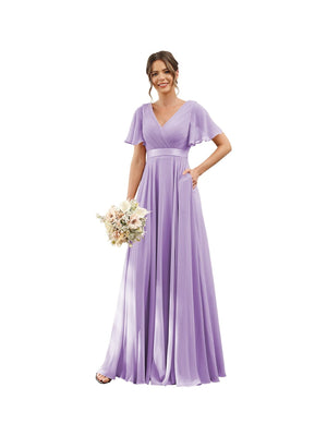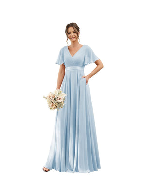 A-Line V Neck Flutter Sleeves Floor Length Bridesmaid Dresses Chiffon with Pockets Ruched