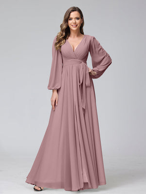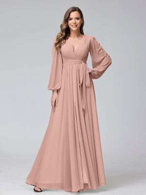 A-Line V-Neck Long Sleeves Chiffon Long Bridesmaid Dresses With Ruffles Split Side