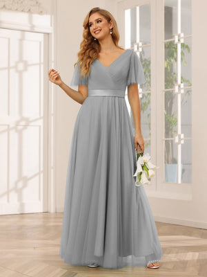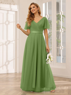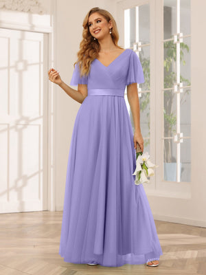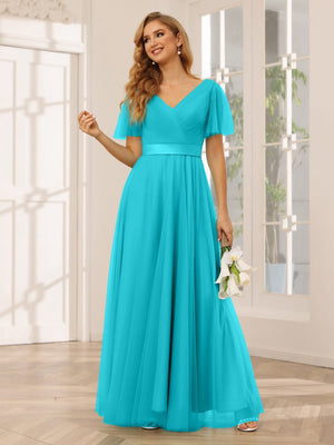 A-Line/Princess V-Neck Short Sleeves Floor-Length Bridesmaid Dresses with Sash