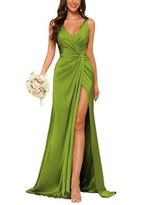 A-Line/Princess V-Neck Sleeveless Ankle-Length Silk Satin Bridemaid Dresses with Pockets & Split Side