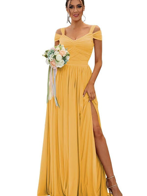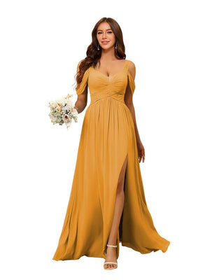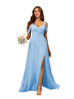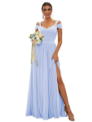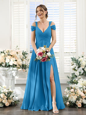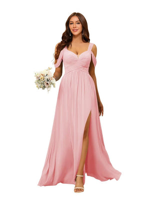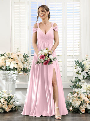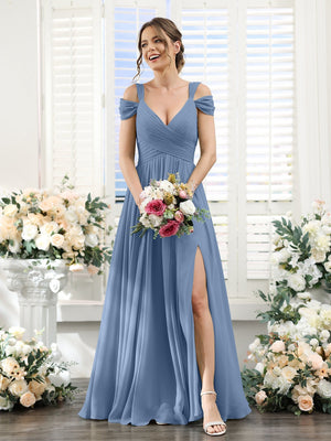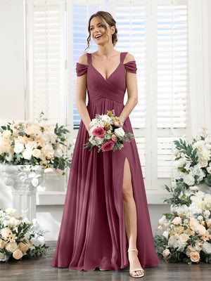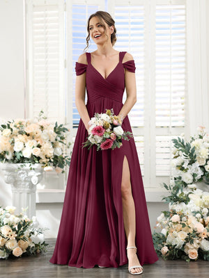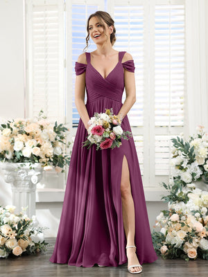 A-Line/Princess V-Neck Floor-Length Chiffon Bridesmaid Dresses with Split Side & Ruched