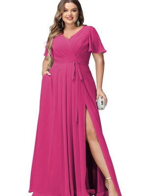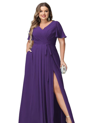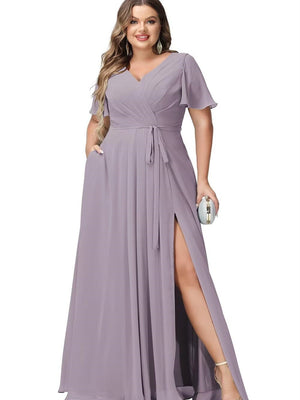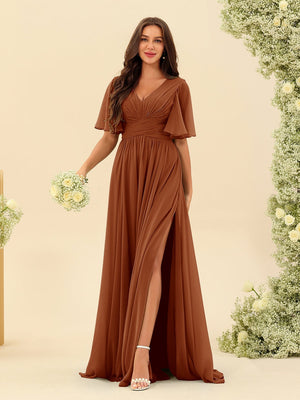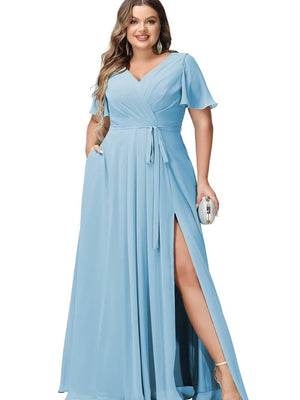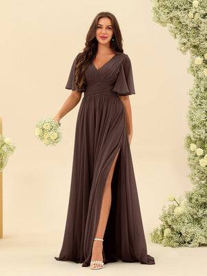 A-Line/Princess V-Neck Half Sleeves Chiffon Bridesmaid Dresses With Pockets & Split Side