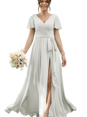 A Line/Princess Chiffon V-Neck Short Sleeves Floor-Length Bridesmaid Dresses
