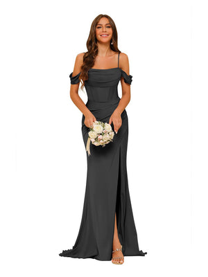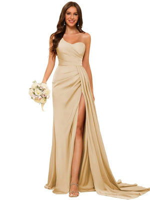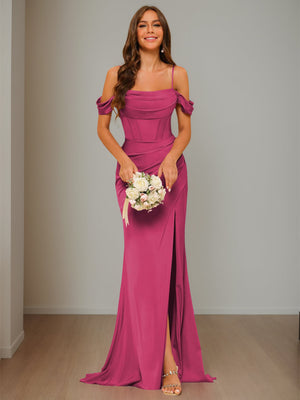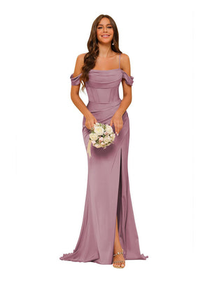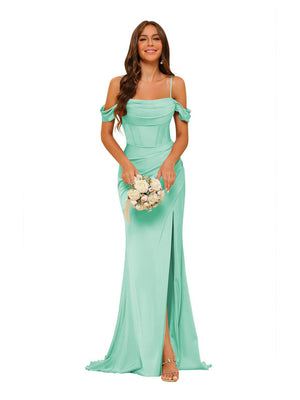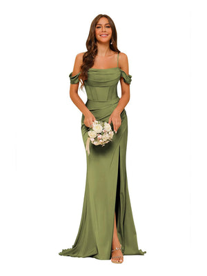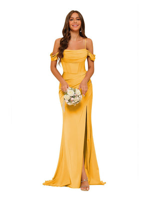 Sheath/Column Off-the-Shoulder Sleeveless Sweep/Brush Train Satin Bridesmaid Dress with Split side