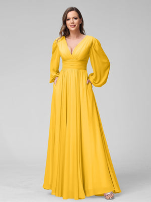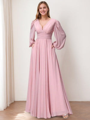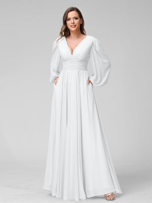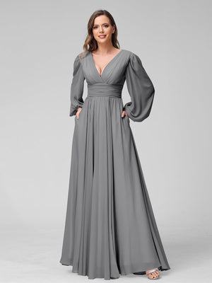 A-Line/Princess V-Neck Long Sleeves Floor-Length Bridemaid Dresses With Split Side & Pockets