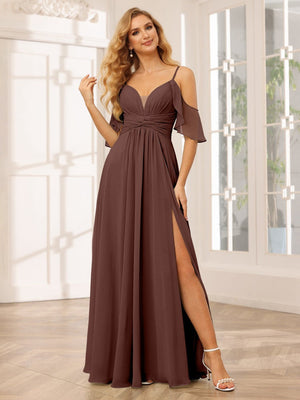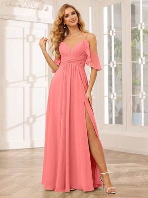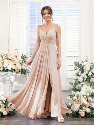 A-Line/Princess V-Neck Spaghetti Straps Sleeveless Floor-Length Chiffon Bridesmaid Dresses with Split Side