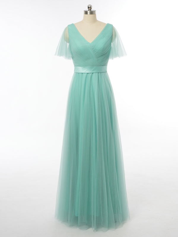#N25110279 A-Line/Princess V-Neck Short Sleeves Bridesmaid Dresses with Ruched