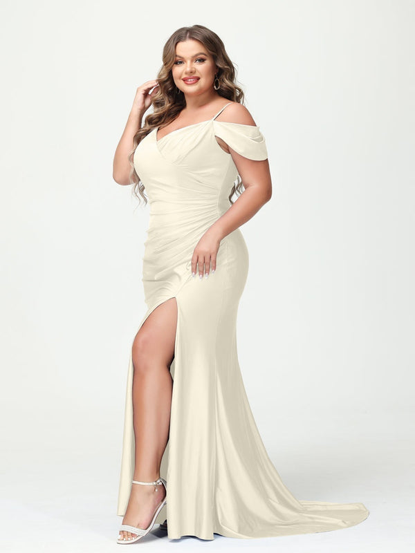 #N5411957 Mermaid Spaghetti Straps V-Neck Short Sleeves Plus Size Maxi Dresses with Split Side