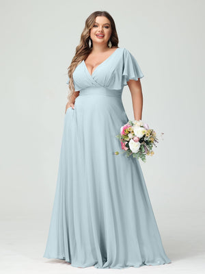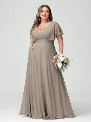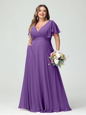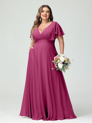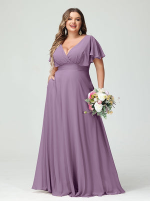 A-Line/Princess V-Neck Half Sleeves Chiffon Plus Size Bridesmaid Dresses with Pockets