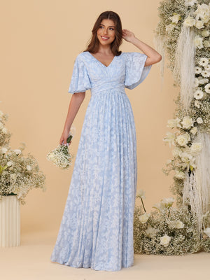 A-Line/Princess V-Neck Short Sleeves Long Bridesmaid Dresses