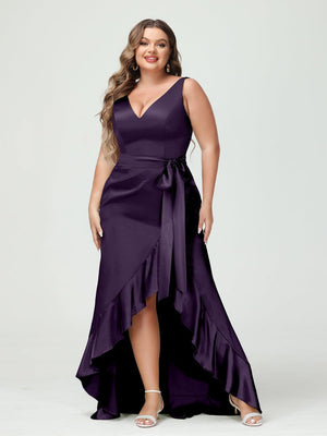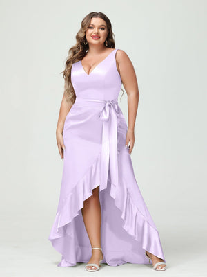 Sheath/Column V-Neck Sleeveless Ruffles High Low Plus Size Dresses with Pockets & Sash