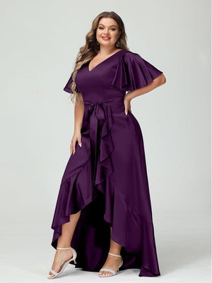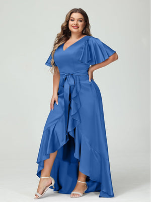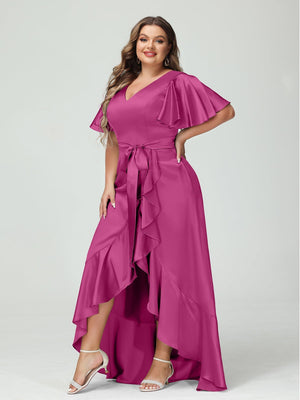 Sheath/Column V-Neck Short Sleeves Ruffles Asymmetrical Plus Size Dresses with Pockets & Sash