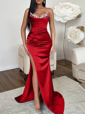 Sheath/Column Spaghetti Straps Sleeveless Floor-Length Long Evening Dresses with Split Side Beading