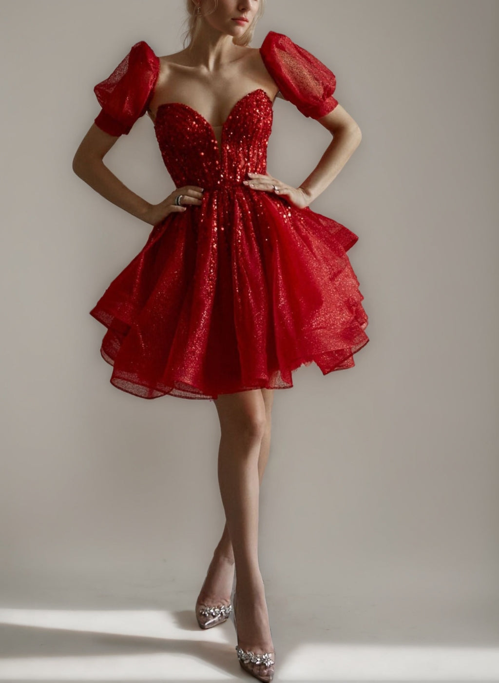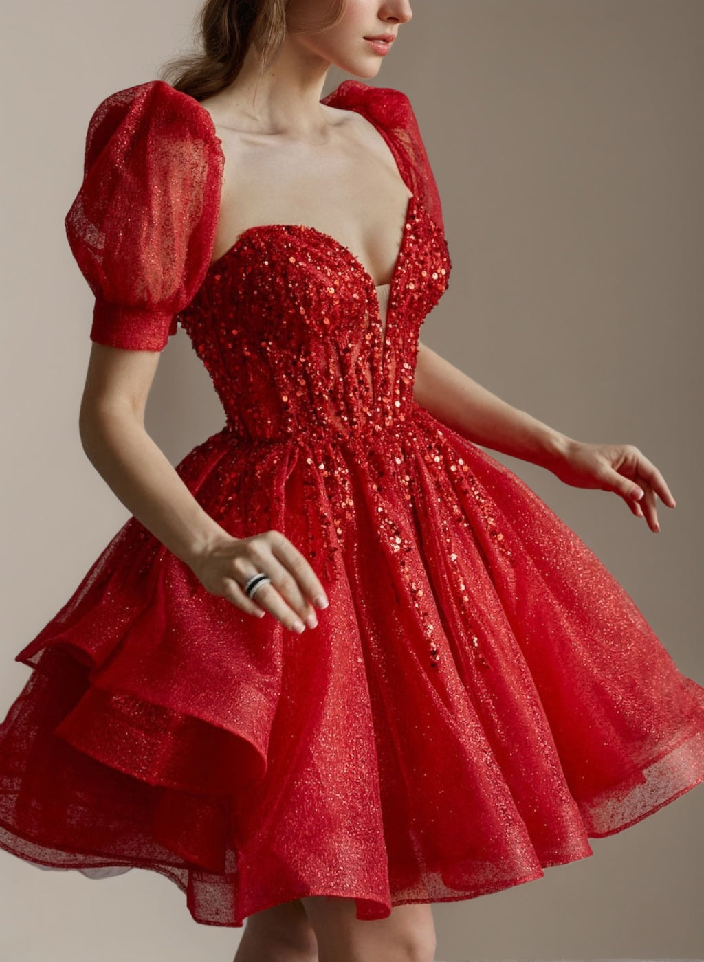 #N342727 A-Line/Princess Sweetheart Short Sleeves Short/Mini Pleated Homecoming Dresses with Sequins & Ruffles
