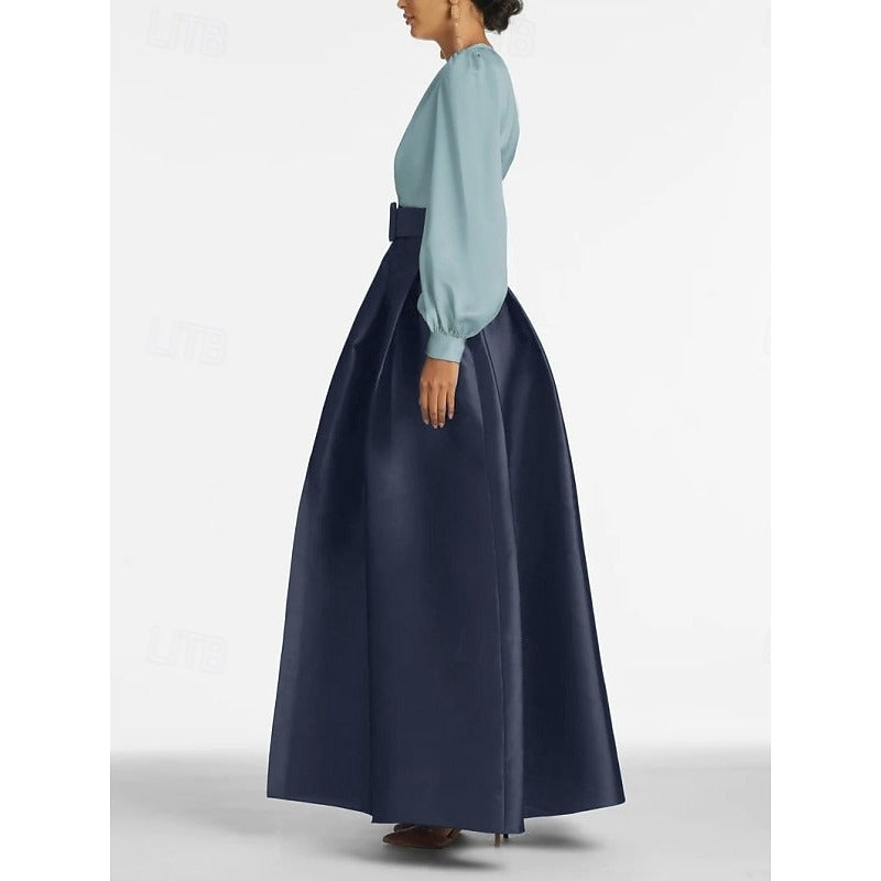 • A-Line Evening Dress High Split Formal Gown Wedding Guest Floor Length Long Sleeve V Neck Belt / Sash Satin with Pleats Slit