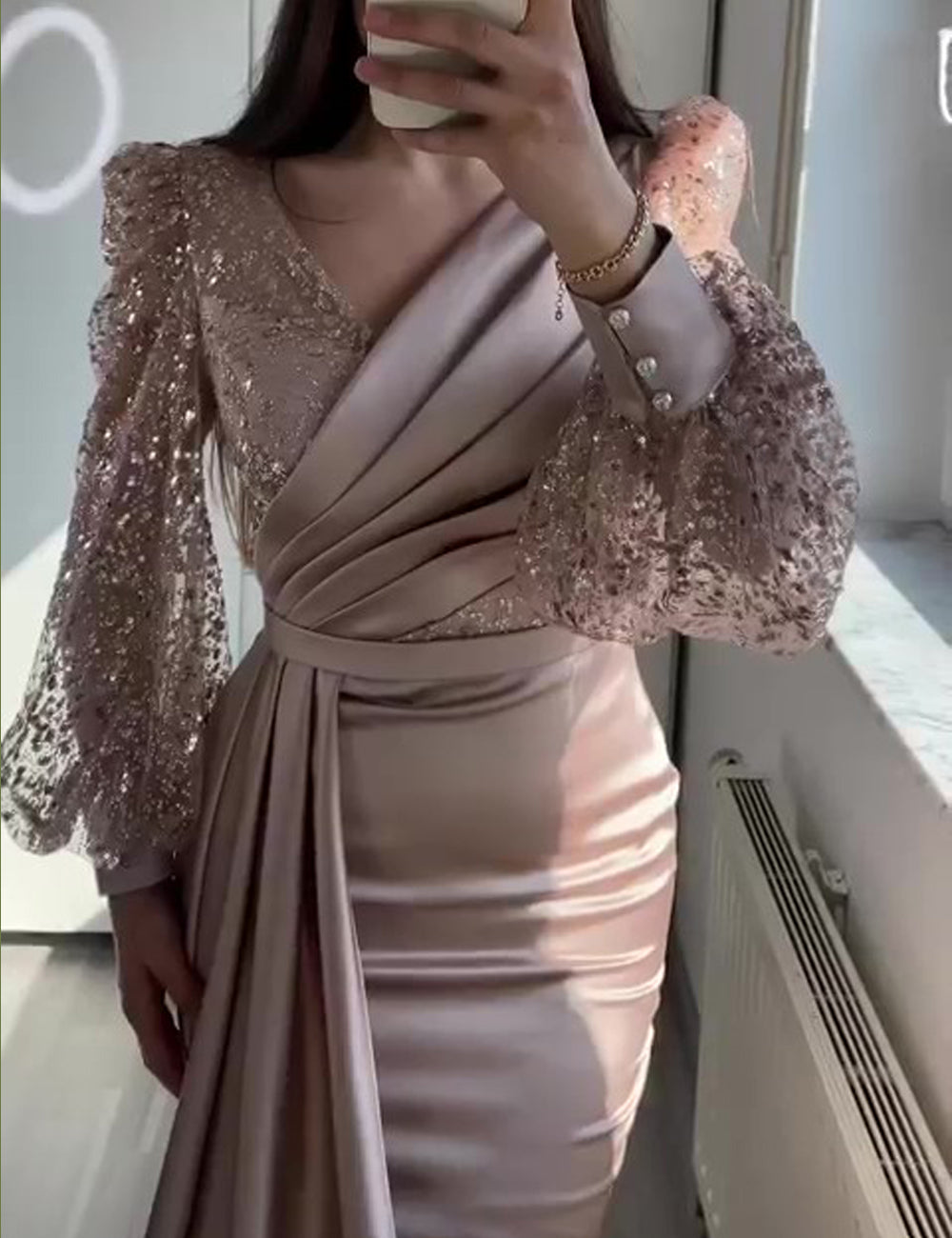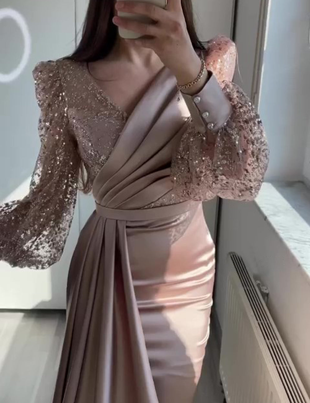 • Mermaid Sequin Evening Gown Ruched Satin Dress Long Sleeves Floor Length V Neck with Sequins Overskirt Prom