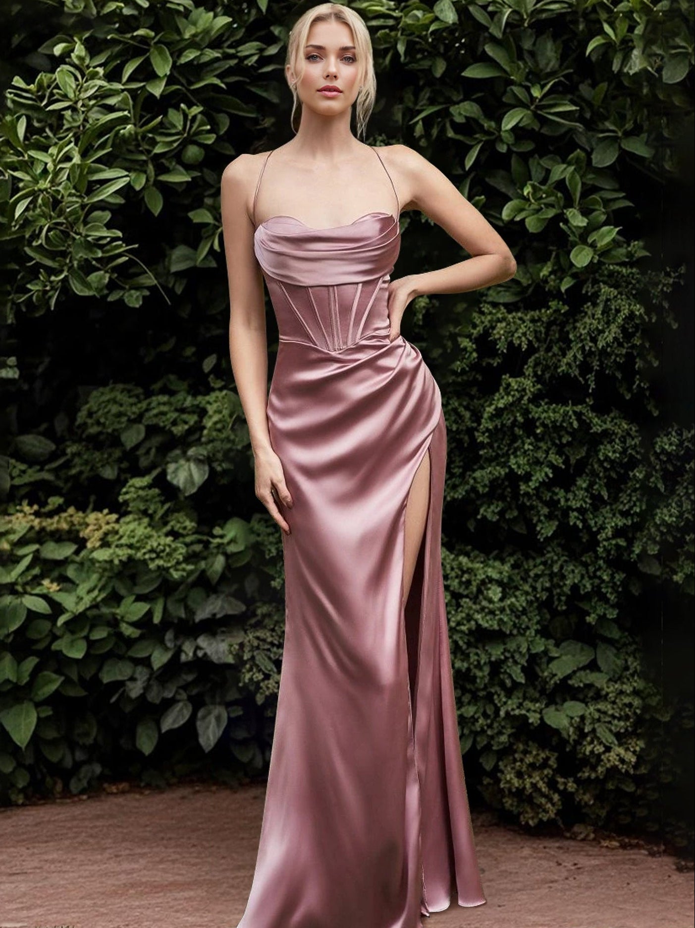 • Sheath/Column Long Corset Prom Dresses Spaghetti Straps Satin Gown Floor-length With High Split Ruched 2026