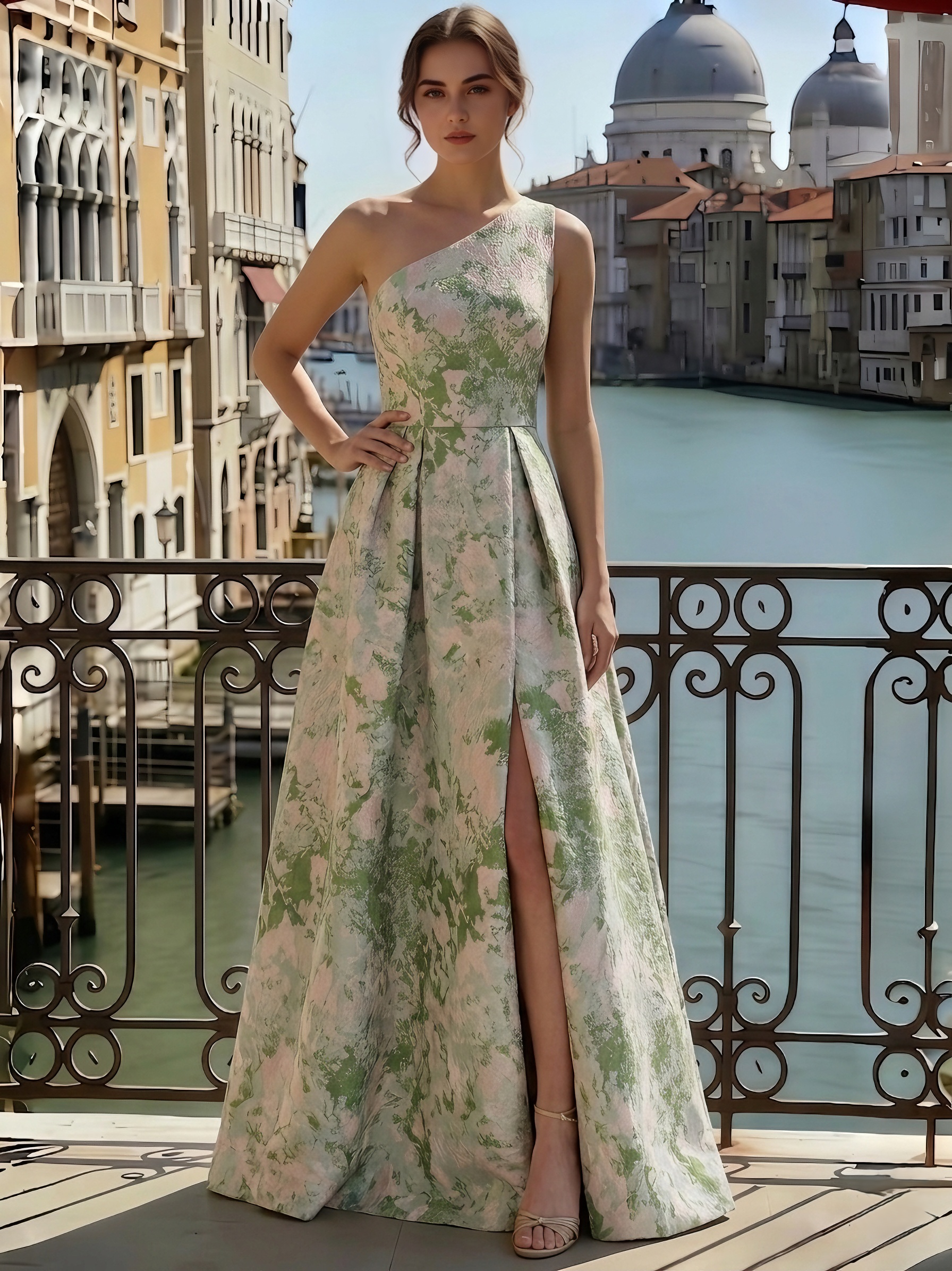 #N366001 A-Line Evening Gown Elegant Jacquard Floral Dress Prom Floor Length Sleeveless One Shoulder with Slit Pocket Sage Wedding Guest Dress