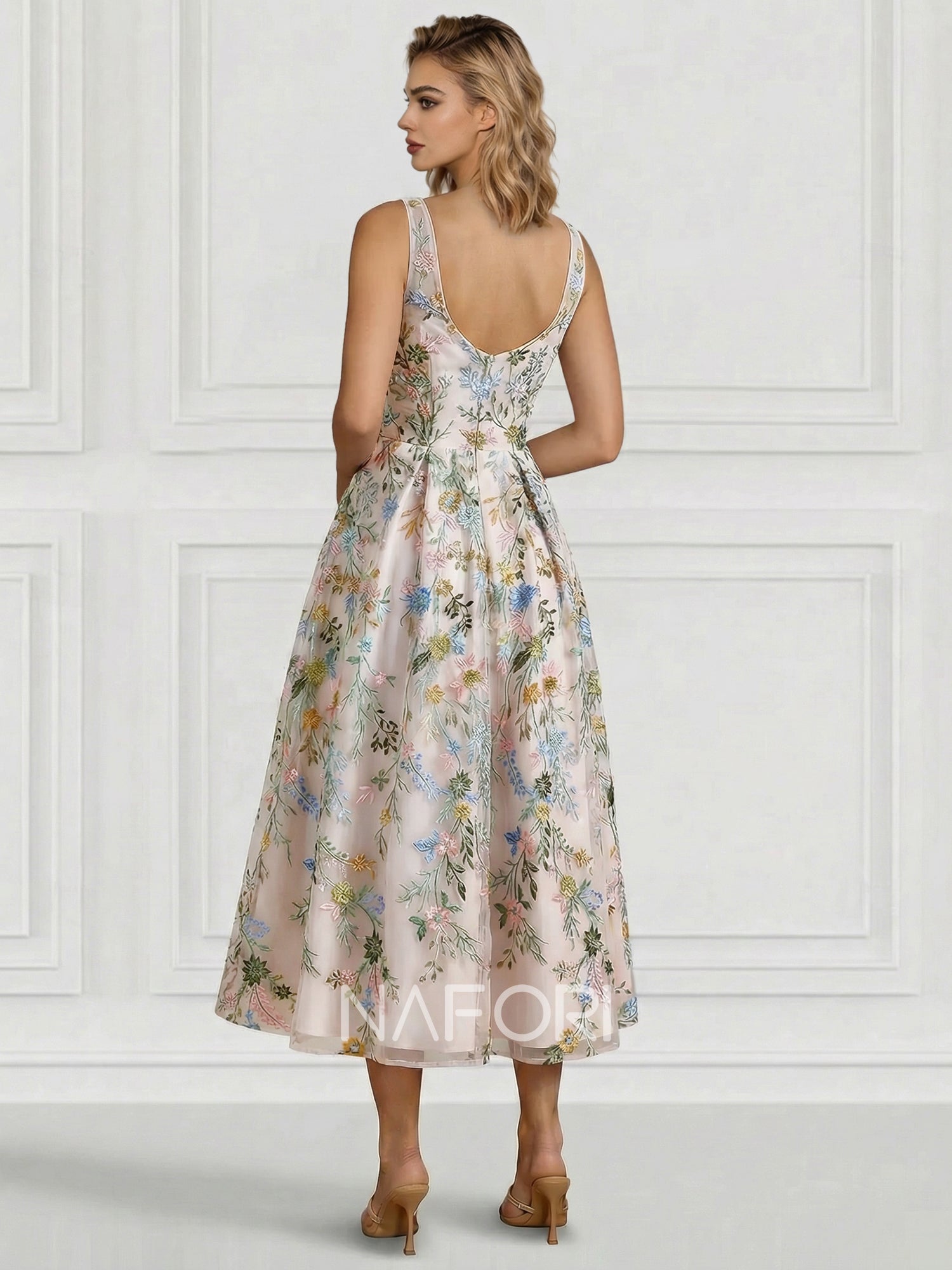 #N363503 A-Line/Princess Elegant Cocktail Dress Square Neck Tea-Length Floral Embroiery Dress Formal Wedding Guest