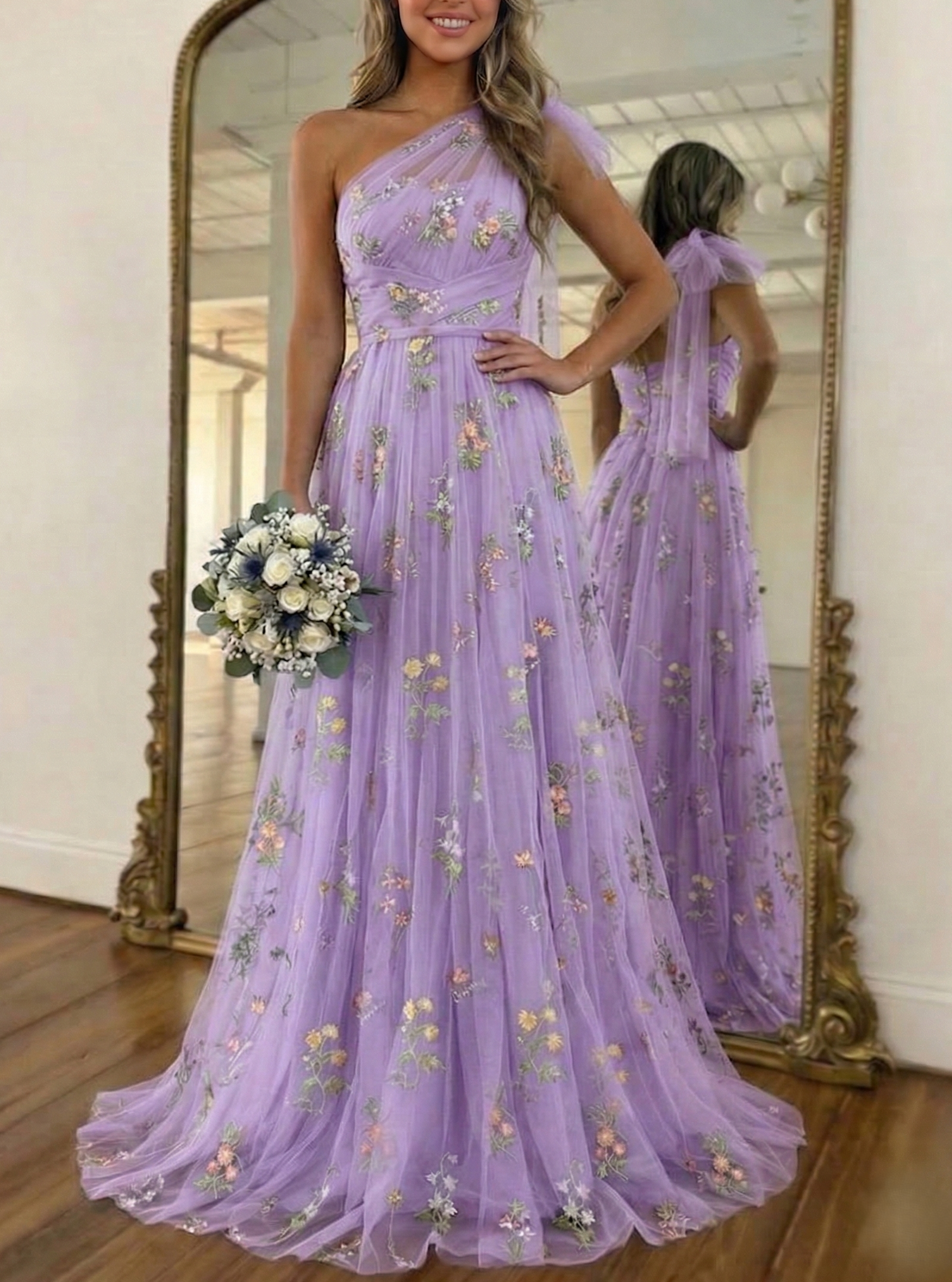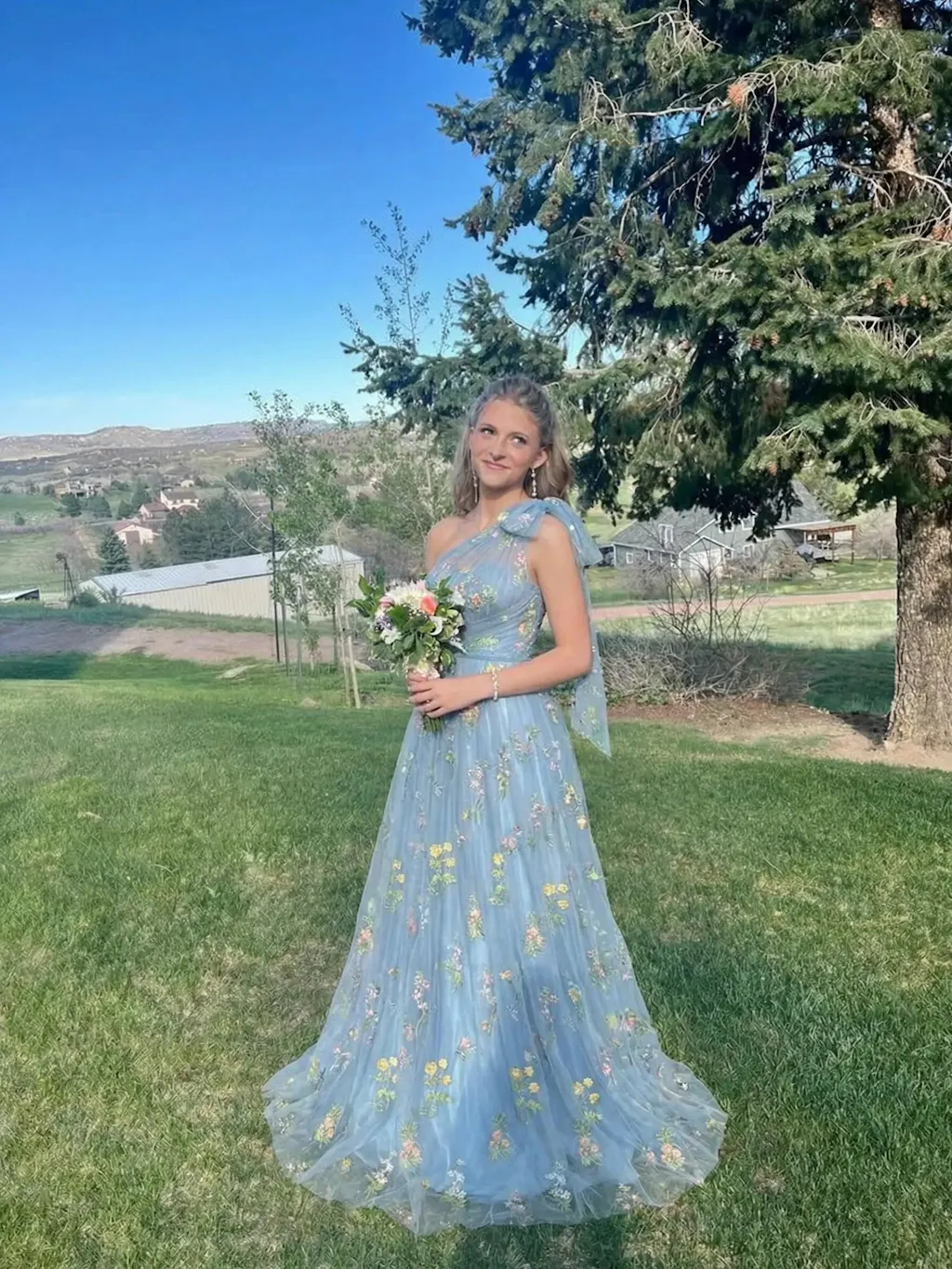 #N469202 A-Line/Princess Green Floral Prom Dresses Tulle One Shoulder Long Formal Dresses with Floral Emboridary