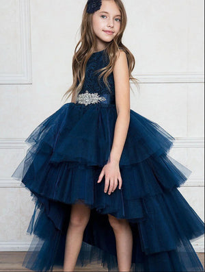 Short Sleeves High Low Round Neck Flower Girl Party Dress with Rhinestone Appliques